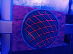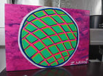 This vibrant geometric artwork features a circular grid pattern rendered in electric neon colors against a bold magenta background. The structured lattice design glows with bright green squares separated by hot pink lines, all contained within a clean white and blue border. Under UV blacklight, the piece transforms into a mesmerizing display of deep blues and purples, creating a completely different mood while maintaining the striking geometric form. The bold color palette and precise symmetry blend contemporary street art aesthetics with optical art principles, creating a dynamic visual experience that shifts dramatically with lighting conditions.